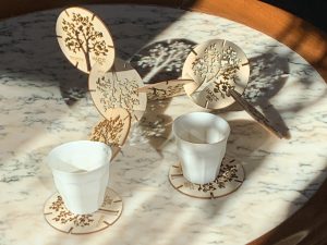 With the coasters you can create your own forest when not in use. Magically, and due to the transparency of this sculptural composition, the shadows reproduce the pattern of the trees on the table.